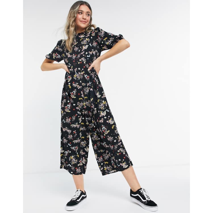 Ffcoshops Design Frill Neck Smock Jumpsuit In Black Based Floral Ffcoshops